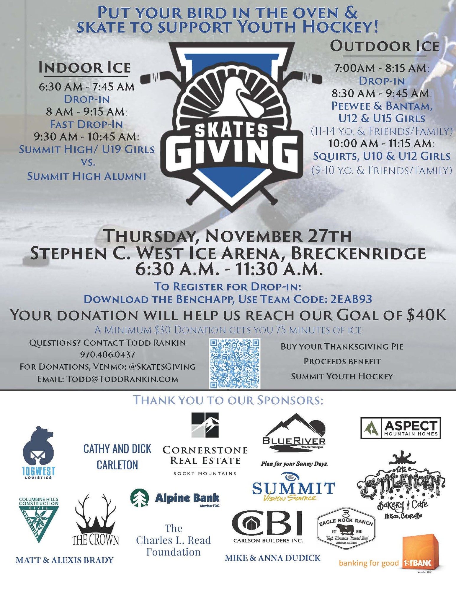 SkatesGiving is a drop in style skate on Thanksgiving morning used to raise funds for your local hockey association. Money is raised via sponsors, skate registration, merchandise and pie sales in order to direct funds to the local youth program. The goal is to help your local association grow the game and get more kids playing. In Breckenridge that means our primary goal is to make the Mite program free and introduce more kids to the sport. On Thanksgiving morning, we rent a few hours of ice and divide up the teams to make sure the teams are leveled. We schedule the appropriate amount of spots per hour so the benches are full, but not too full and we play some hockey. We don’t keep score. We just have lots of fun and make sure everyone touches the puck. It is a non-competitive, fun and inclusive skate for everyone of all skill levels. Are your kids coming home from college? Do they want to get on the ice with their friends? Perfect….sign them up. Does your 12 year old hockey player not have a Thanksgiving tournament? Great! Get her on the ice. Mom and Dad…don’t forget to bring your skates too.
